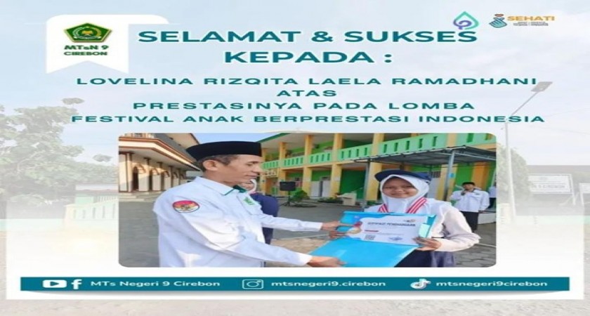 Cirebon – MTsN 9 Cirebon kembali menorehkan prestasi membanggakan melalui siswinya, Lovelina Rizqita Laela Ramadhani dari kelas IX A. Pada ajang Festival Anak Berprestasi Indonesia (FABI) tingkat Kota/Kabupaten yang berlangsung di Indramayu pada 11 Mei 2025, Lovelina berhasil meraih tiga Medali Perunggu sekaligus pada mata pelajaran Bahasa Inggris, Matematika, dan Sains.